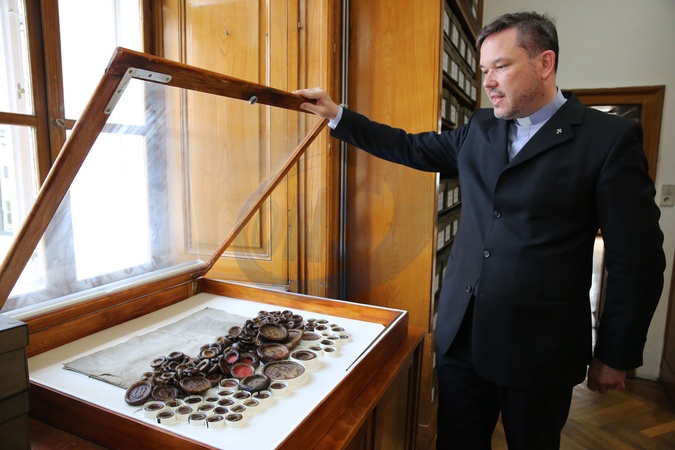 ks. Frank Bayard glowny ksiegowy zakonu pokazuje archiwa
