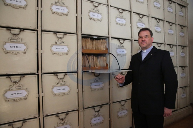 ks. Frank Bayard glowny ksiegowy zakonu pokazuje archiwa