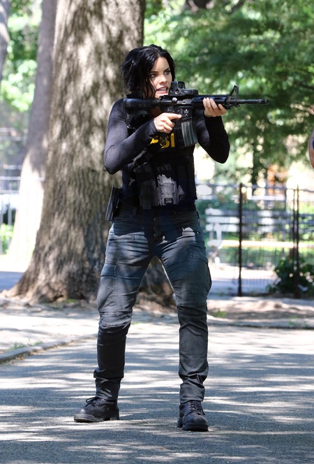 Jaimie Alexander z karabinem na planie zdjeciowym
