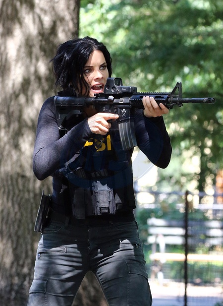 Jaimie Alexander z karabinem na planie zdjeciowym