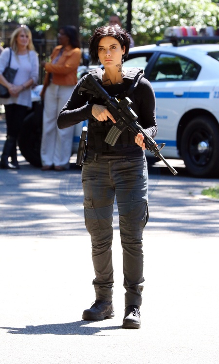 Jaimie Alexander z karabinem na planie zdjeciowym