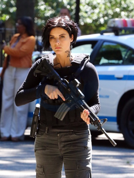 Jaimie Alexander z karabinem na planie zdjeciowym