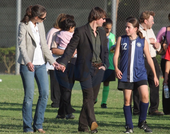 Tom Cruise z narzeczona Katie Holmes i z mama Mary Lee, podczas meczu swojej adoptowanej corki Isabelli w Los Angeles