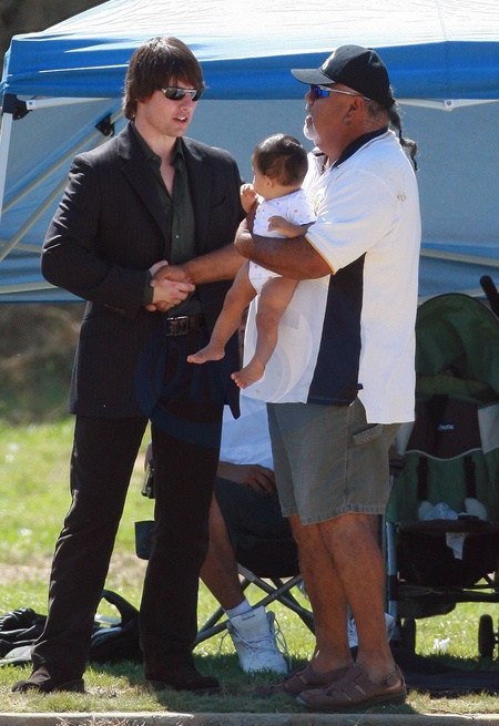 Tom Cruise z narzeczona Katie Holmes i z mama Mary Lee, podczas meczu swojej adoptowanej corki Isabelli w Los Angeles