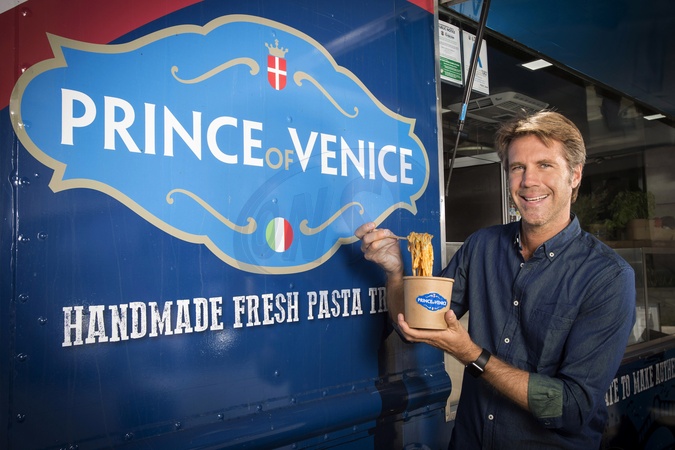Emanuel Filibert, ksiaze Wenecji i Piemontu sprzedaje z auta dania z makaronu