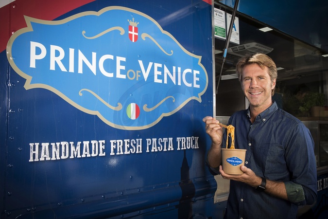 Emanuel Filibert, ksiaze Wenecji i Piemontu sprzedaje z auta dania z makaronu