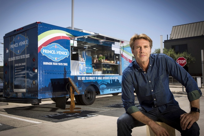 Emanuel Filibert, ksiaze Wenecji i Piemontu sprzedaje z auta dania z makaronu
