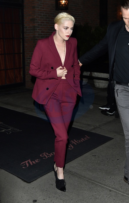 Kristen Stewart w bordowym garniturze, bez bluzki