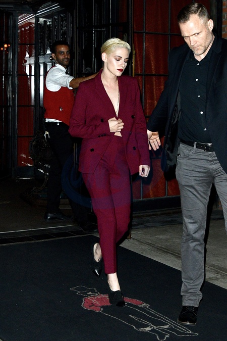 Kristen Stewart w bordowym garniturze, bez bluzki