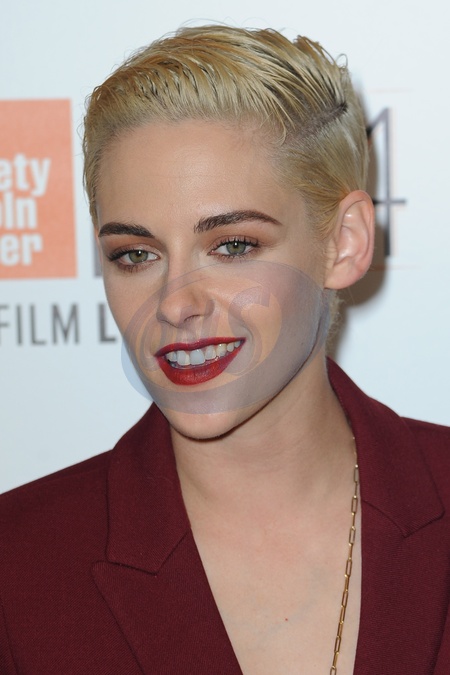 Kristen Stewart w bordowym garniturze, bez bluzki