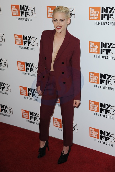 Kristen Stewart w bordowym garniturze, bez bluzki