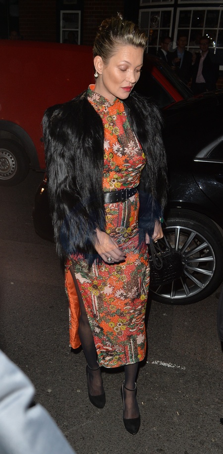 Kate Moss w czarnym futerku i wzorzystej sukience