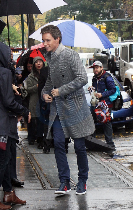 Eddie Redmayne w szarym plaszczu w drodze do tv