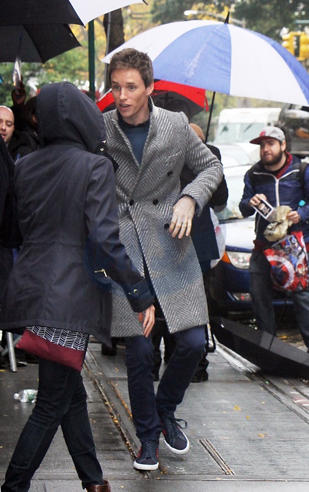 Eddie Redmayne w szarym plaszczu w drodze do tv