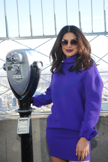 Priyanka Chopra w fioletowej, luznej sukience na Empire State Building