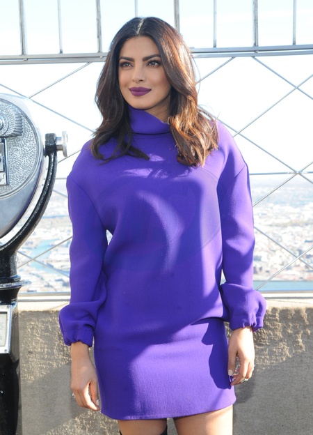 Priyanka Chopra w fioletowej, luznej sukience na Empire State Building