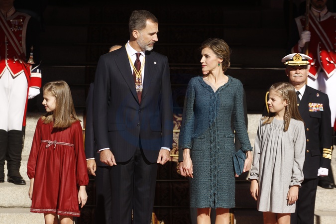Ksiaze Filip i Letizia z corkami w Narodowym Parlamencie