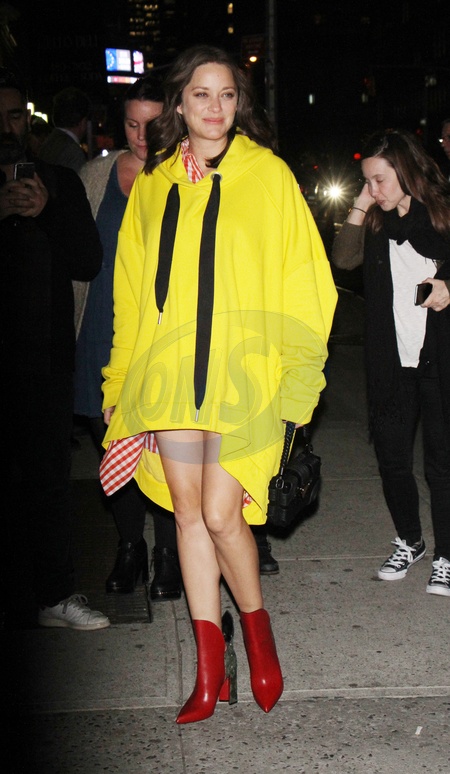 Marion Cotillard w zoltej bluzie oversize i bordowych kozakach