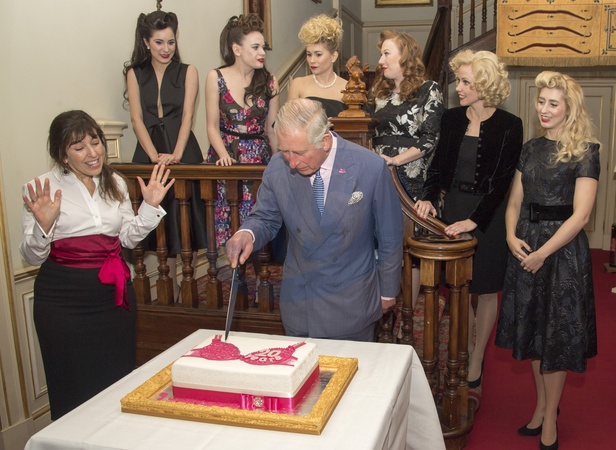 Ksiaze Karol w gronie kobiet kroi tort w ksztalcie stanika