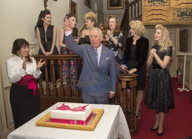Ksiaze Karol w gronie kobiet kroi tort w ksztalcie stanika