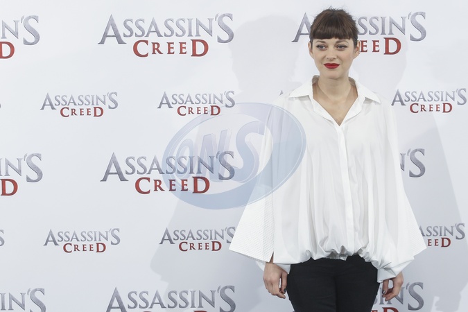 Marion Cotillard w bialej koszuli na photocall Assassins Creed, Madryt