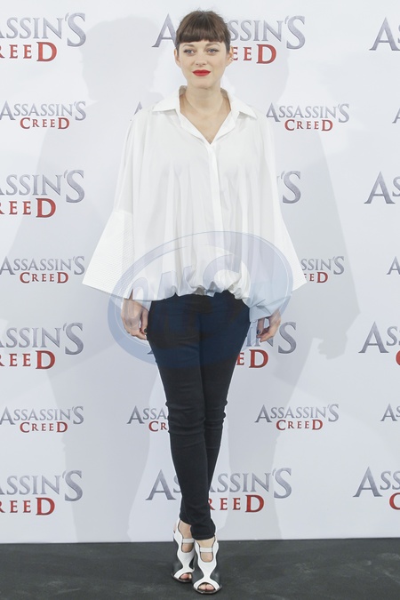 Marion Cotillard w bialej koszuli na photocall Assassins Creed, Madryt