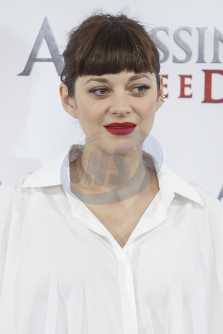 Marion Cotillard w bialej koszuli na photocall Assassins Creed, Madryt