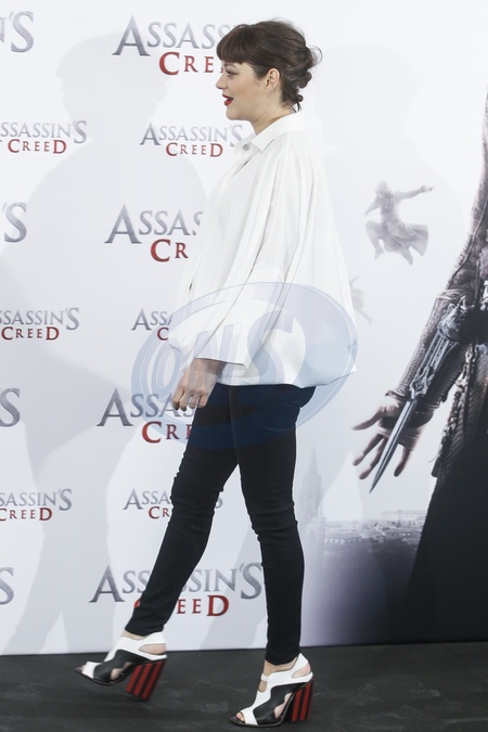 Marion Cotillard w bialej koszuli na photocall Assassins Creed, Madryt