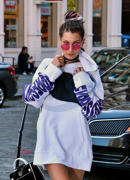 Bella Hadid w sportowej bluzie i rozowych okularach idzie odwiedzic siostre