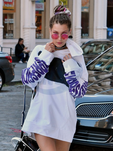 Bella Hadid w sportowej bluzie i rozowych okularach idzie odwiedzic siostre