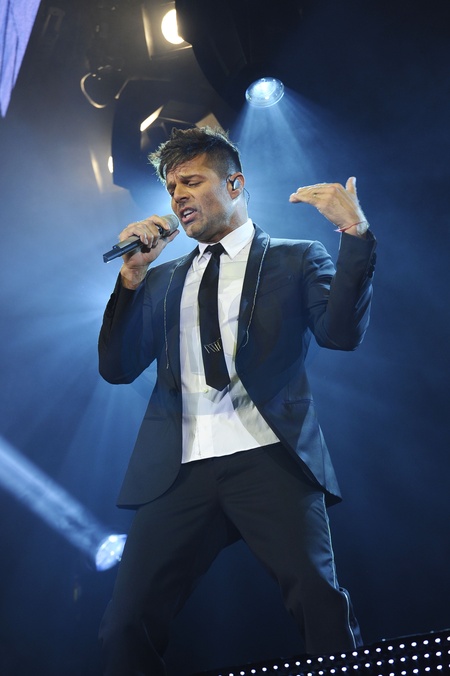Ricky Martin w garniturze i krawacie na koncercie w Londynie