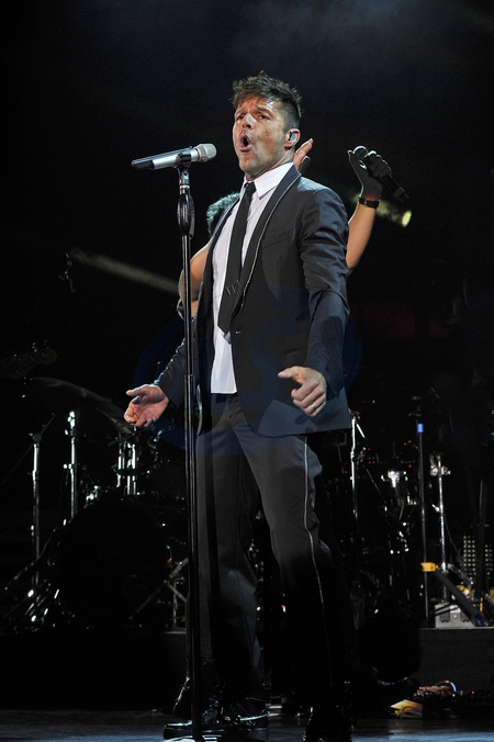 Ricky Martin w garniturze i krawacie na koncercie w Londynie