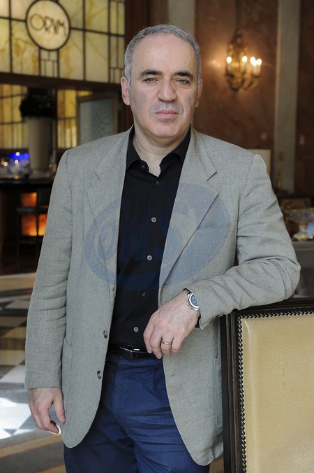 Garri Kasparow pozuje do zdjec z szachami