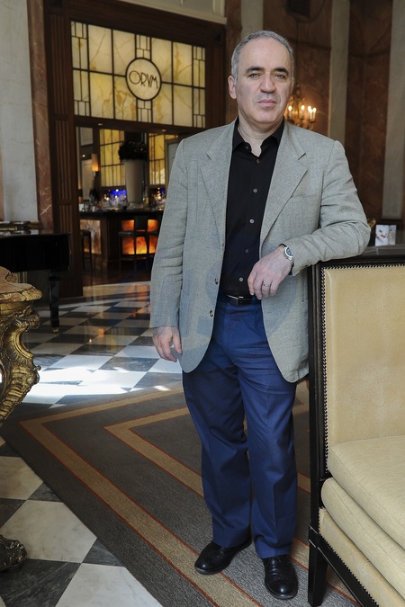 Garri Kasparow pozuje do zdjec z szachami