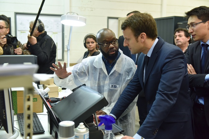 Emmanuel Macron podczas wizyty w przedsiebiorstwie APF Entreprise 93