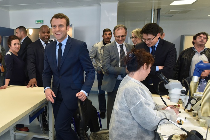 Emmanuel Macron podczas wizyty w przedsiebiorstwie APF Entreprise 93