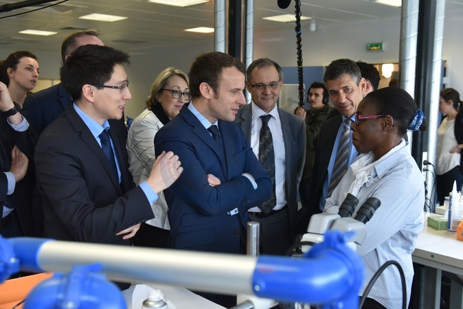 Emmanuel Macron podczas wizyty w przedsiebiorstwie APF Entreprise 93