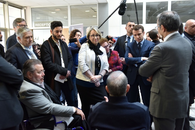 Emmanuel Macron podczas wizyty w przedsiebiorstwie APF Entreprise 93