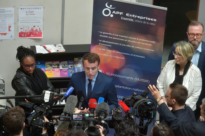 Emmanuel Macron podczas wizyty w przedsiebiorstwie APF Entreprise 93