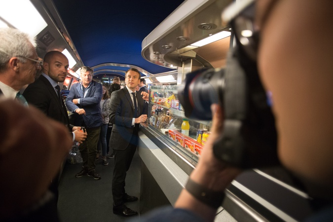 Emmanuel Macron pije piwko i je orzeszki w pociagu TGV