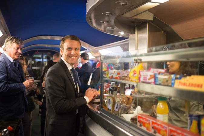 Emmanuel Macron pije piwko i je orzeszki w pociagu TGV