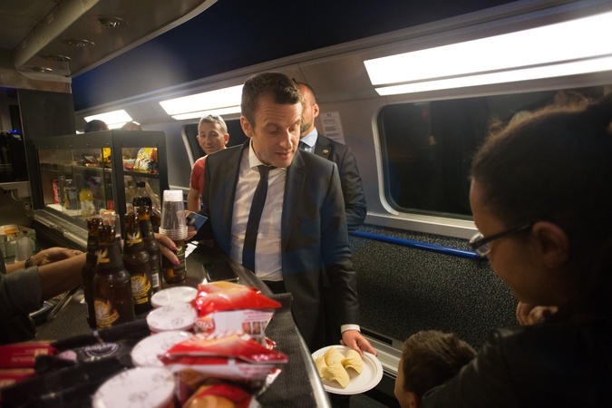 Emmanuel Macron pije piwko i je orzeszki w pociagu TGV
