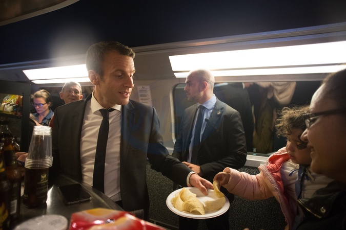 Emmanuel Macron pije piwko i je orzeszki w pociagu TGV