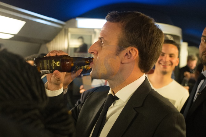 Emmanuel Macron pije piwko i je orzeszki w pociagu TGV