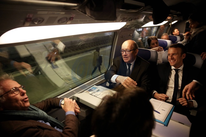 Emmanuel Macron w pociagu, w drodze na spotkanie w Nantes