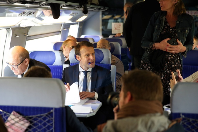 Emmanuel Macron w pociagu, w drodze na spotkanie w Nantes