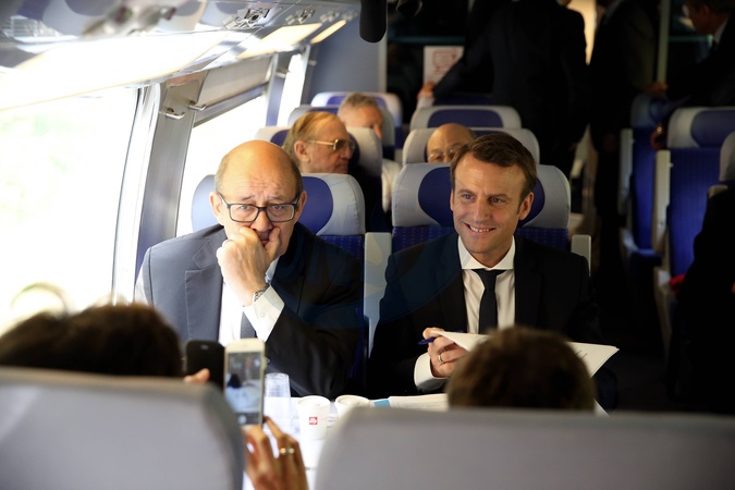 Emmanuel Macron w pociagu, w drodze na spotkanie w Nantes