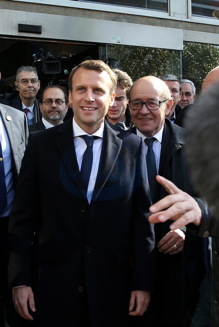 Emmanuel Macron w pociagu, w drodze na spotkanie w Nantes