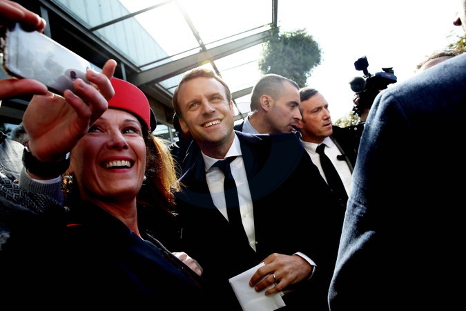 Emmanuel Macron w pociagu, w drodze na spotkanie w Nantes