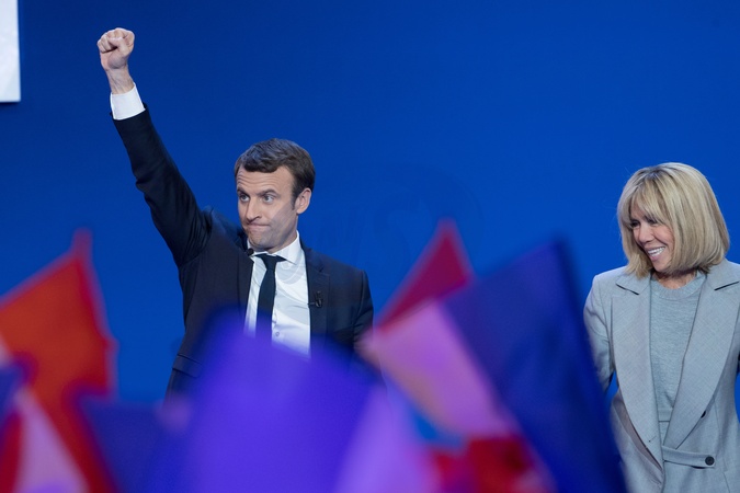 Emmanuel Macron z zona ciesza sie ze zwyciestwa w 1 turze wyborow